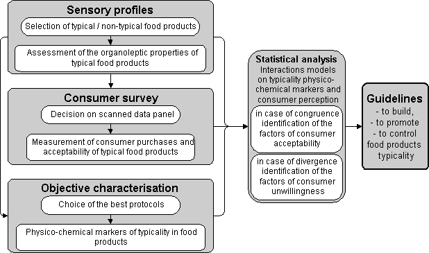 ContentsWithin the TYPIC project nine research partners and eight subcontractors will work on four work-packages. Work-Package 1 aims at selecting typical food products (dry-cured hams and red wines, under origin-labelling and other labels across the EU) and to assess their organoleptic properties. Work-Package 2 will measure consumer purchase and acceptability of typical food products. This will focus on consumers' preferences for typical food products and on their actual buying behaviour. Work-Package 3 will characterise physico-chemical traits of typicality. This aims at analysing on a few selected products, physico-chemical properties that could help provide objective bases for typicality. Work-Package 4 will propose guidlines to build, to control and to promote typicality. The final Work-Package (WP) will combine all analyses and establish relationships between them. Guidelines to improve the reliability of typical food products claims, for both consumers and producers but also for the rest of the agro-food chain, will be based on the conclusions presented in the other Work-Packages. See 'Work Plan' for more information. Work Plan
